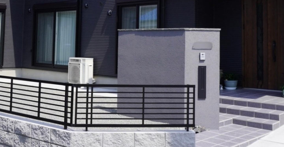 門柱は建物の外壁カラーと相性の良いスモーキーグレーを採用し、上質な質感を活かした塗り仕上げに。ポストや表札をブラックでまとめることで、引き締まった印象とモダンなアクセントをつくり、邸宅全体の統一感を高めています。